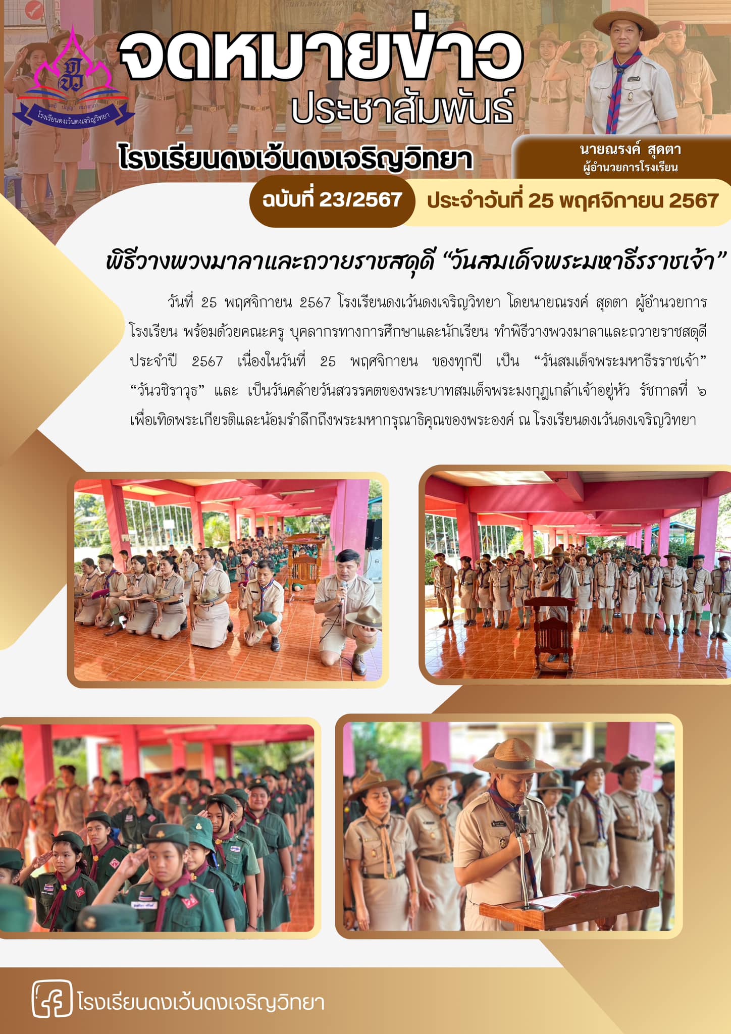 วันที่ 25 พฤศจิกายน 2567 โรงเรียนดงเว้นดงเจริญวิทยา โดยนายณรงค์ สุดตา ผู้อำนวยการโรงเรียน พร้อมด้วยคณะครู บุคลากรทางการศึกษาและนักเรียน ทำพิธีวางพวงมาลาและถวายราชสดุดี ประจำปี 2567 เนื่องในวันที่ 25 พฤศจิกายน ของทุกปี เป็น “วันสมเด็จพระมหาธีรราชเจ้า” “วันวชิราวุธ” และ เป็นวันคล้ายวันสวรรคตของพระบาท สมเด็จพระมงกุฎเกล้าเจ้าอยู่หัว รัชกาลที่ ๖ เพื่อเทิดพระเกียรติและน้อมรำลึกถึงพระมหากรุณาธิคุณของพระองค์ ณ โรงเรียนดงเว้นดงเจริญวิทยา