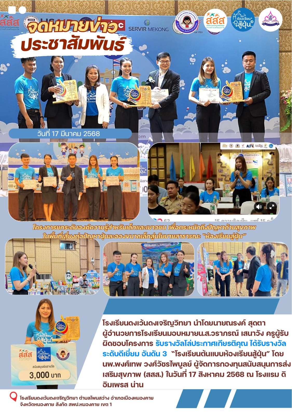 ขอแสดงความยินกับโรงเรียนดงเว้นดงเจริญวิทยาเข้ารับรางวัลโล่ประกาศเกียรติคุณ รางวัลระดับดีเยี่ยม อันดัน 3 “โรงเรียนต้นแบบห้องเรียนสู้ฝุ่น” โครงการยกระดับองค์ความรู้สำหรับเด็กและเยาวชน เพื่อตระหนักถึงปัญหาด้านสุขภาพในพื้นที่เสี่ยงต่อปัญหาฝุ่นละอองขนาดเล็กสู่นโยบายสาธารณะ “ห้องเรียนสู่ฝุ่น” โดย นพ.พงศ์เทพ วงศ์วัชรไพบูลย์ ผู้จัดการกองทุนสนับสนุนการส่งเสริมสุขภาพ (สสส.) ในวันที่ 17 มีนาคม 2568 ณ โรงแรม ดิ อิมเพรส น่าน