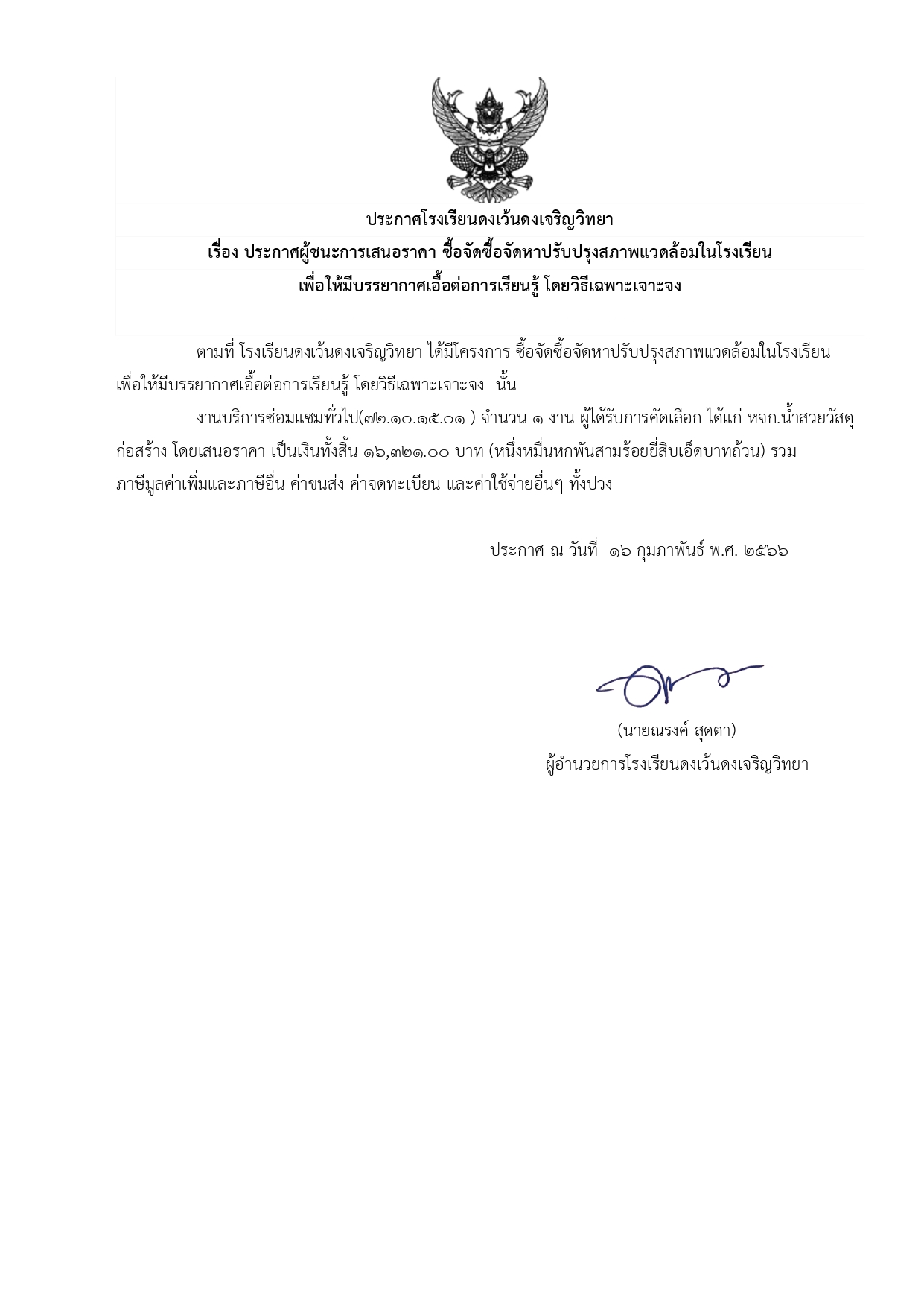 ประกาศผู้ชนะการเสนอราคา ซื้อจัดซื้อจัดหาปรับปรุงสภาพแวดล้อมในโรงเรียน เพื่อให้มีบรรยากาศเอื้อต่อการเรียนรู้ โดยวิธีเฉพาะเจาะจง